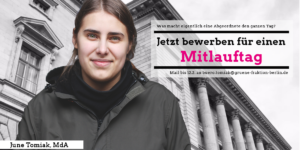 Was macht eigentlich eine Abgeordnete den lieben langen Tag? Als Abgeordnete sind wir Vertreter*innen aller Berliner*innen. Doch viele wissen gar nicht, was das genau bedeutet und wie der Alltag als Parlamentarierin eigentlich aussieht. Deswegen möchte ich euch herzlich einladen, mich einen Tag durch den Politiktrubel zu begleiten. Wie wird Politik gemacht? Wo bringe ich mich … Jetzt für einen Mitlauftag bewerben! weiterlesen