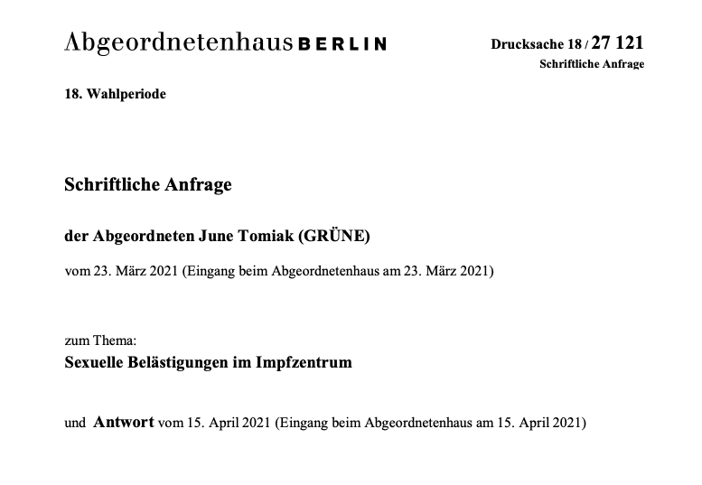 Der Vorfall, die fehlende Transparenz & der Umgang mit meiner parlamentarischen Anfrage sind inakzeptabel. Jede*r muss sich beim impfen sicher fühlen können. Das Land Berlin hat die Pflicht das zu gewährleisten. Ich werde weiter nachhaken. Der Fall zeigt aber leider eneut, wie normalisiert sexuelle Belästigungen sind.